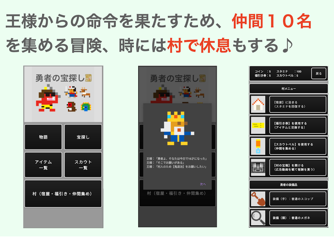 公園や広場が宝探しの場所に変わる!地図に示された場所へ移動することで宝探しができるアプリです。臆病な勇者の仲間集めをぜひ手伝って鬼退治をしましょう。