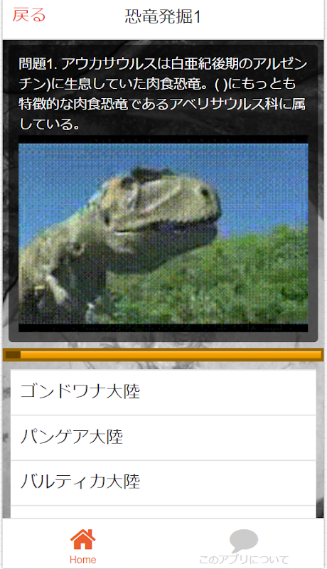 恐竜に関する本格的なクイズアプリです。さらに、画像を取り入れより臨場感が出るように工夫しました。恐竜(きょうりゅう)は、脊椎動物の分類群の一つである。