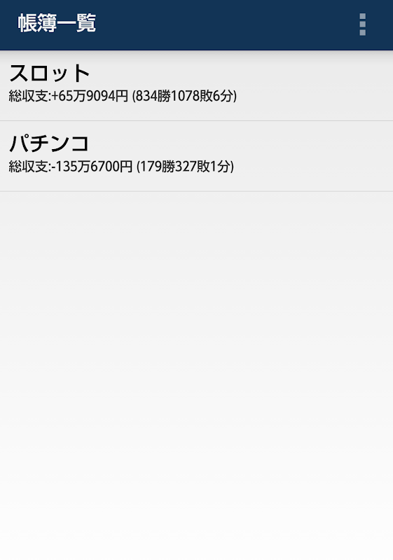 各帳簿ごとに、トータルの収支、勝敗数を表示します。