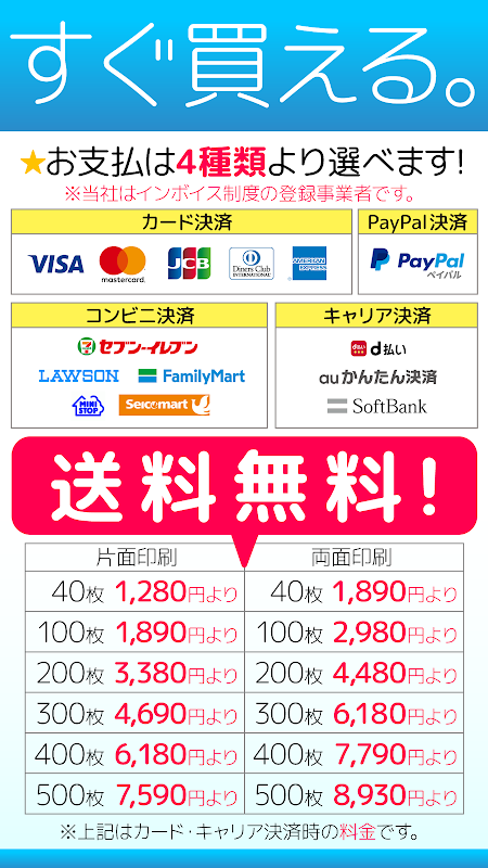 デザインしたら即座に注文できる簡単名刺作成アプリ。カード決済またはキャリア決済、コンビニ決済に加え、PayPal決済も追加しました。