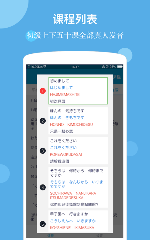 みんなの日本语、25授业の初级有声课程と25授业进めて阶有声教程を含んで、単语、構文、会话、文法、すべての高清真人が発音します。
