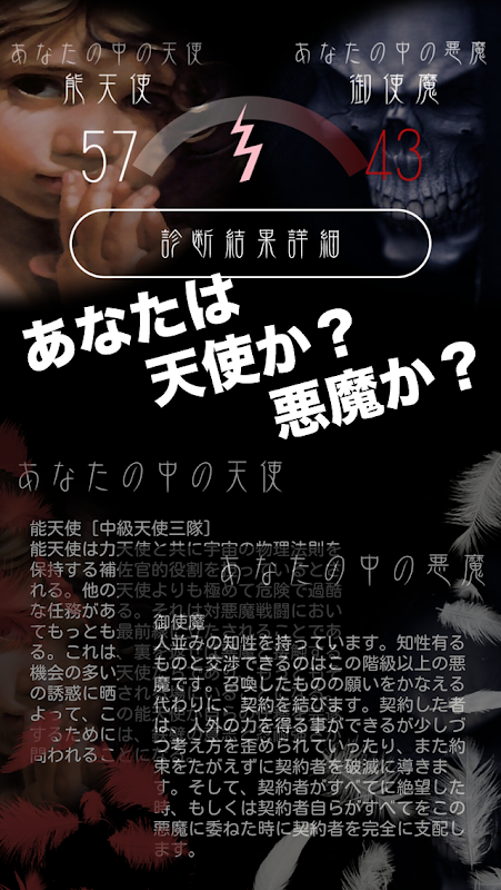 天使と悪魔診断は無料の占いやよく当たる心理テストに興味のある人、好きな人も楽しめるアプリです。