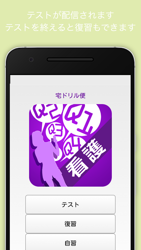 スマホラーニングシステム「宅ドリル便 システム」(※要登録)から定期的に配信される、看護師国家試験過去問題の小テストを行うためのアプリです。