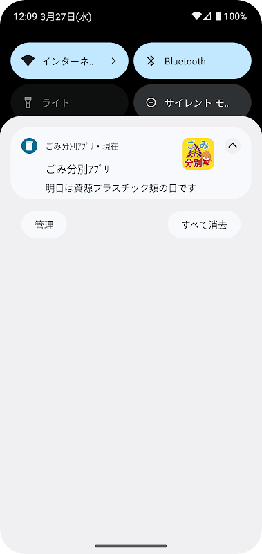 収集予定のごみ種別を前日と当日にアラートでお知らせします。時間は自由に設定することができます。