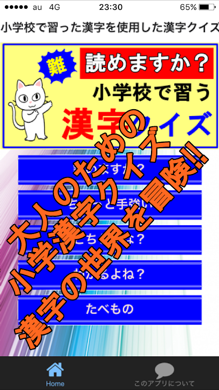 小学校で習った漢字のみ利用したクイズアプリです。簡単な漢字の組み合わせですがなかなか手強い!!文字の底力にびっくり!のめりこんでいく不思議な感覚が面白い!