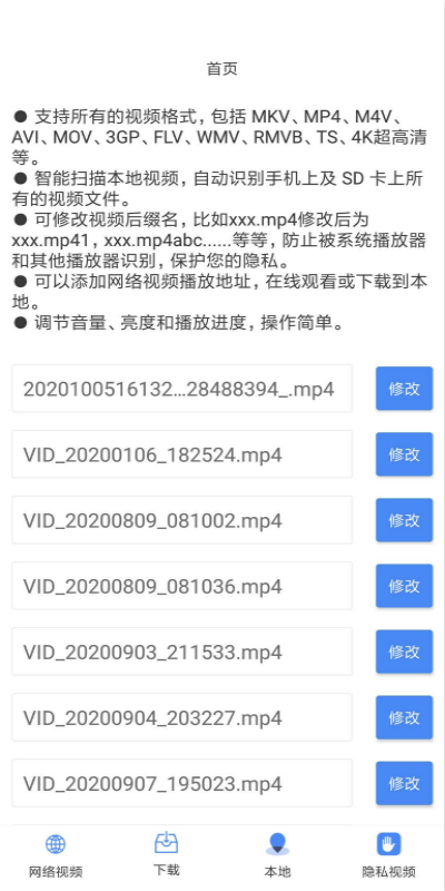 ● 可修改视频后缀名,比如xxx.mp4修改后为xxx.mp41,xxx.mp4abc......等等,防止被系统播放器和其他播放器识别,保护您的隐私。