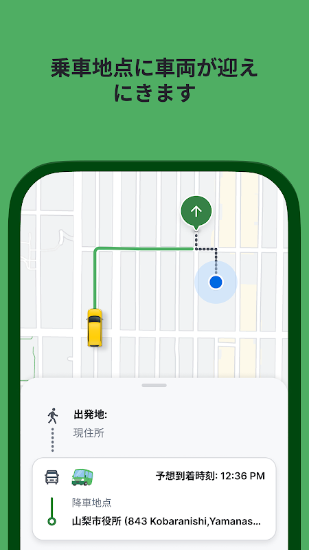 「山梨市デマンド型交通」は、運行エリア内で乗りたい場所から行きたい場所への移動が便利になる、山梨市が提供する新しい公共交通サービスです。
