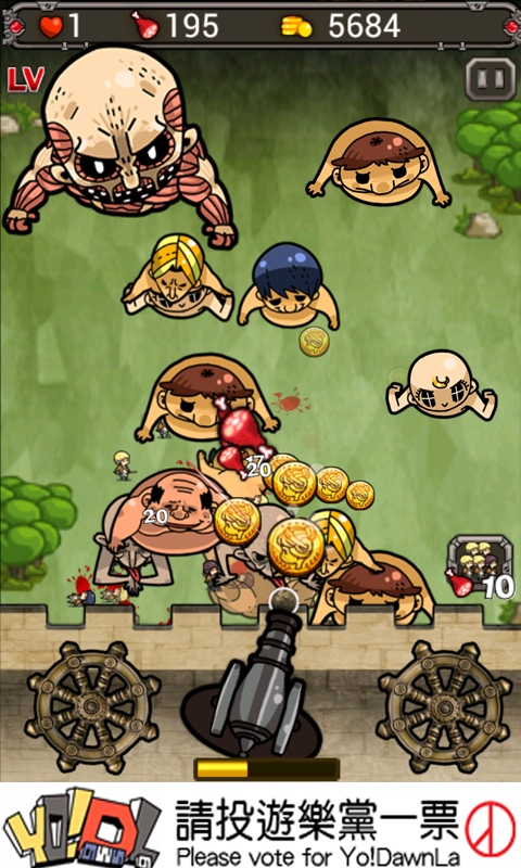 打倒巨人之後會獲得金幣跟食物等資源,活用現有資源將固定炮強化升級,並且訓練出更精銳的兵團來擊退巨人們吧!