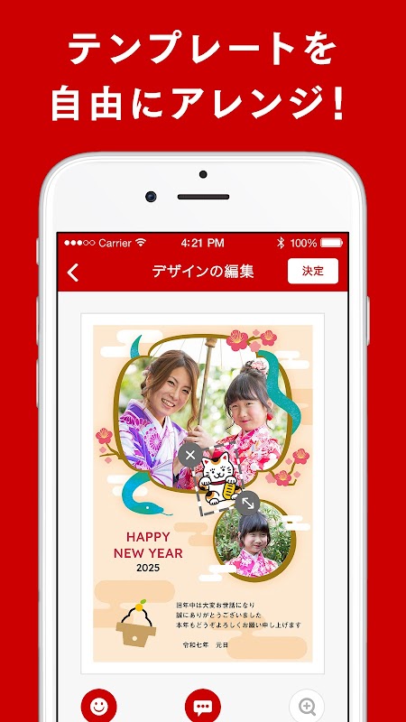 ・ポップな干支キャラクターデザインではなく、書道のようなフォントを用いてシンプルな年賀状デザインにするため、文字も編集できる年賀状ソフトのような年賀状作りアプリが欲しい