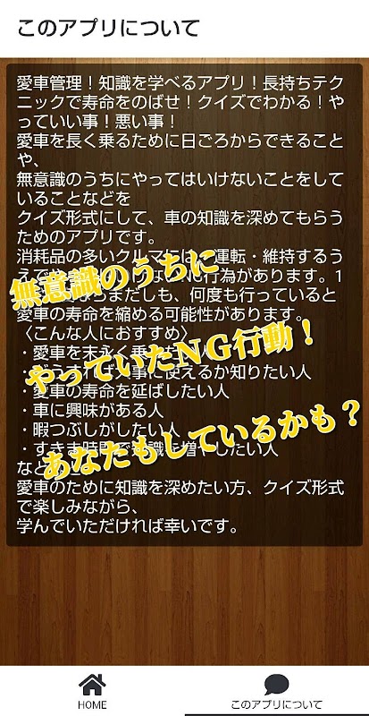 クイズ形式にして、車の知識を深めてもらうためのアプリです。