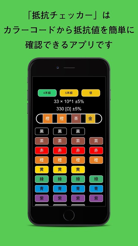 本アプリを使えば調べたい色をタップするだけで、その抵抗値を簡単に調べることができます。