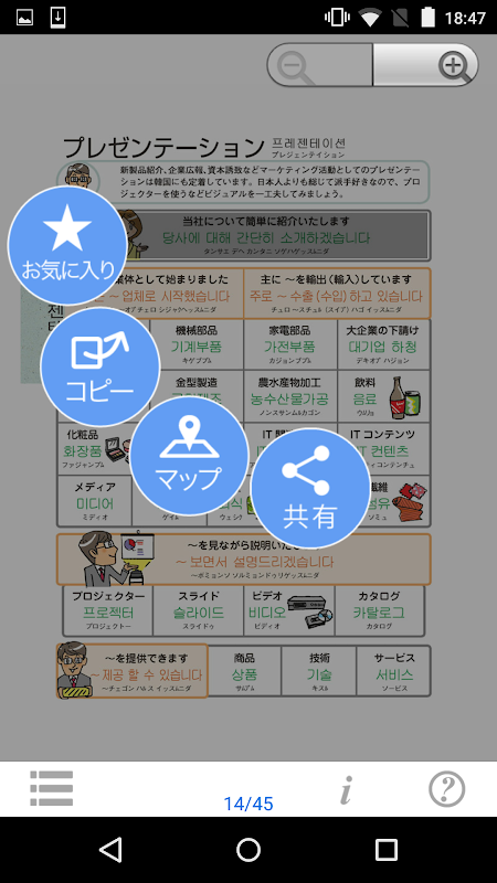 フレーズをタップするとネイティブ音声が出ます。出張・商談だけではなく、韓国語学習にも便利です。