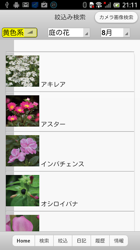 庭や道端などで撮った花の画像を認識させることで画像の花色に近い花を検索できます。