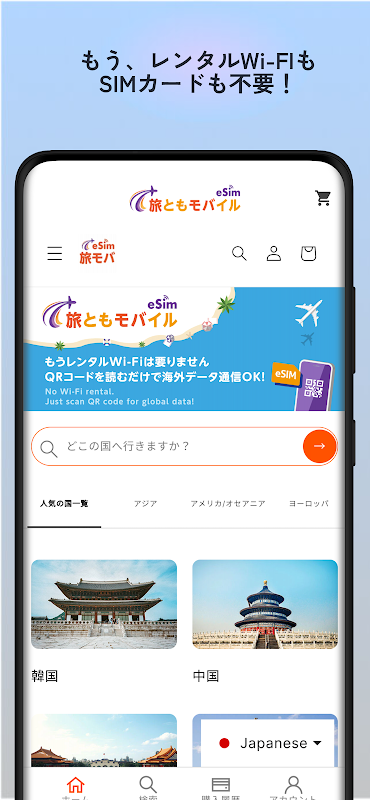 レンタルWiFiもSIMカードも不要!海外データ通信専用のプリペイドeSIM販売ショップ「旅ともモバイル」の閲覧アプリ