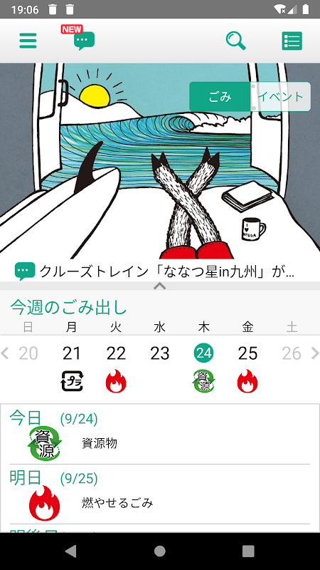今日と明日、週ごと、月ごとの3パターンによるごみ収集日程を一つの画面ですぐに確認することができます。