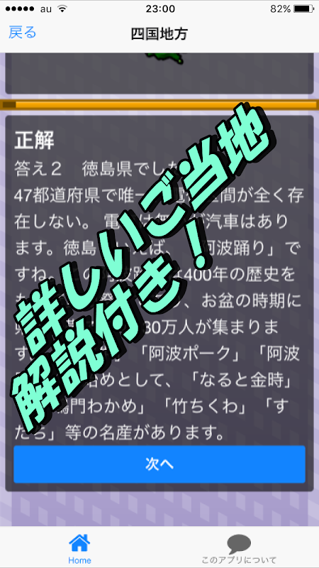 日本地図を地域別に分け県のシルエットから県名を当てるクイズアプリです。 解説には、ご当地情報が満載。 住んでいる地域、生まれ故郷以外を知ることが出来ます。