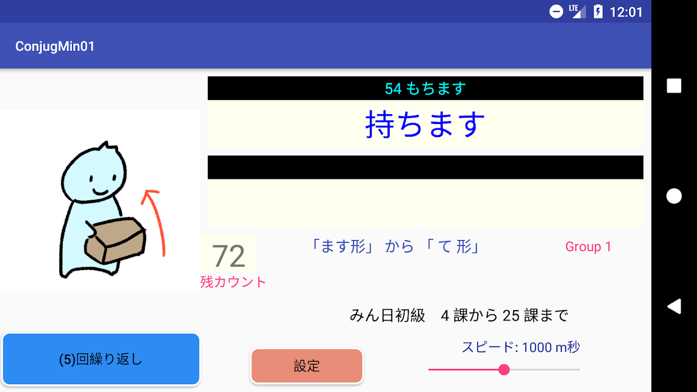 ・動詞は「みんなの日本語 初級I」の4課から25課までをベースとしており、157語収録しています。データを編集することにより対応可能ですので、間違いがあったらメールで教えて下さい(^^)/