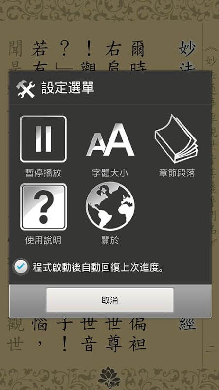 系統設計上除了念誦位置引導、自動翻頁、字體大小調整,也提供了次頁銜接的預覽功能,每頁最後一句為次頁的第一句,如此在翻頁時減少了視覺上或意識上經句銜接上的問題。更多的小細節還需要您下載使用體驗!
