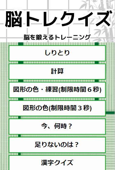 計算・しりとり・暗記など、 いろんな種類の問題が出題される、 ボケ防止・認知症予防にもオススメの無料アプリゲームです。