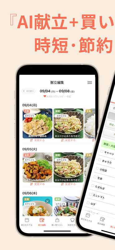 (最長)1週間分の献立が簡単に作れるアプリ。買い物リストも自動作成されるから買い物もラクラク♪