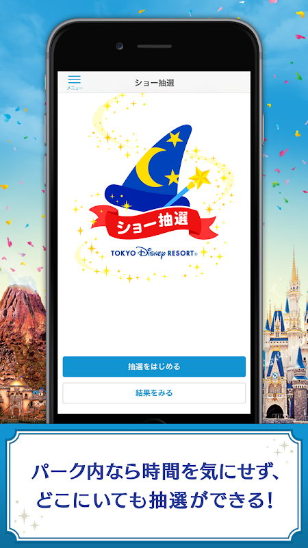 東京ディズニーリゾートで座席指定券が必要なエンターテイメントショーの抽選を、パーク内で、いつでも、どこでも、お好きなタイミングでできるアプリです!