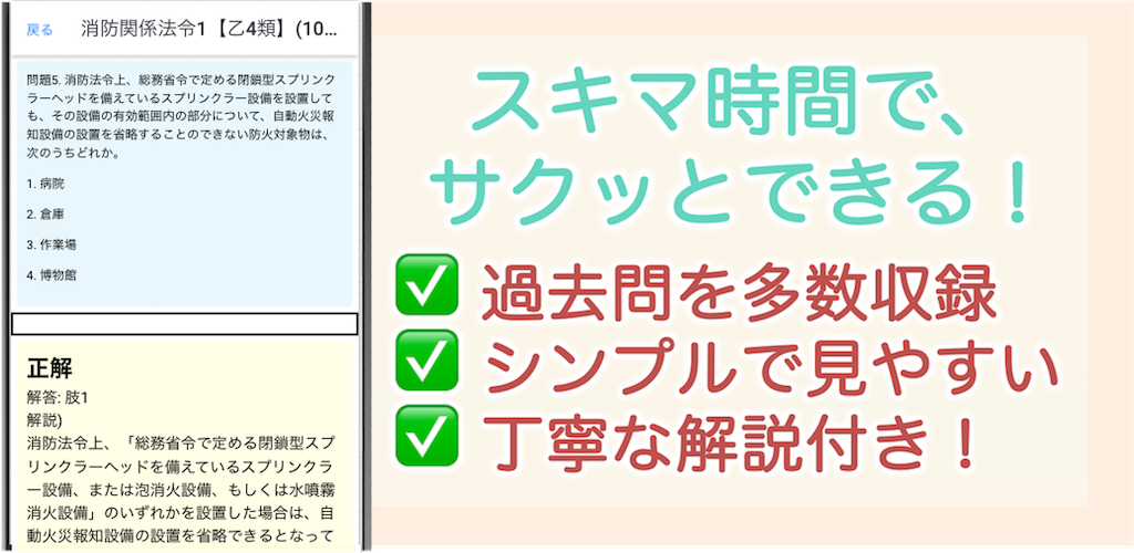 消防設備士 乙種 第4類の頻出分野をスピード学習! 過去問を隙間時間に解き、学習できる消防設備士 乙4対策アプリです。 詳細な解説付きです。