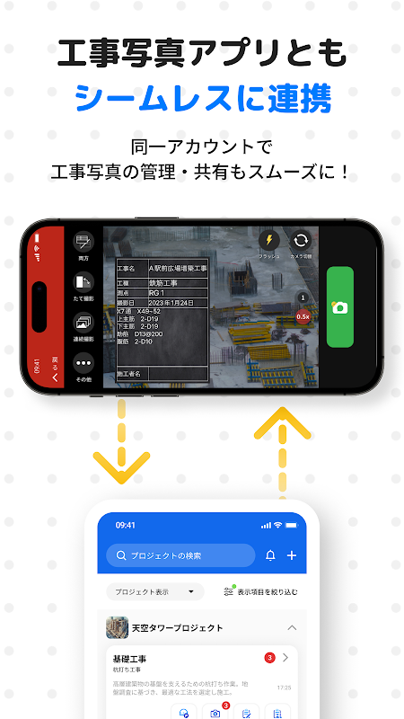 本アプリは累計20万ダウンロード突破の工事写真アプリ「ミライ工事写真」とアカウント情報やデータが連携されます。