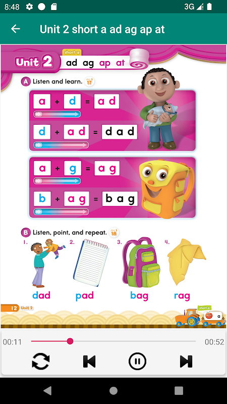 このレベルには、8つの学習ユニットと4つのレビューユニットがあります。学習ユニットは、主にa、e、i、o uの短い音の発音と、猫、ラム、ウェブ、ヒップ、ピンなどの発音に対応する閉じた音節の単語の学習について説明し、最後に提示されたプレゼンテーションを確認します短編小説の説明を通して各ユニットで。文字の発音。復習ユニットでは、前のユニットで学んだ単語をまとめて練習するために、陽気な歌やゲームを使って、生徒が学んだ文字や単語を読んだり、聞いたり、話したりできるようにします。