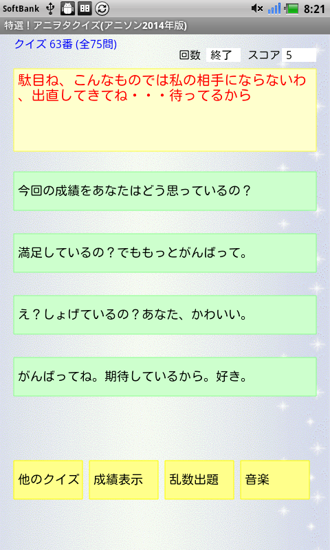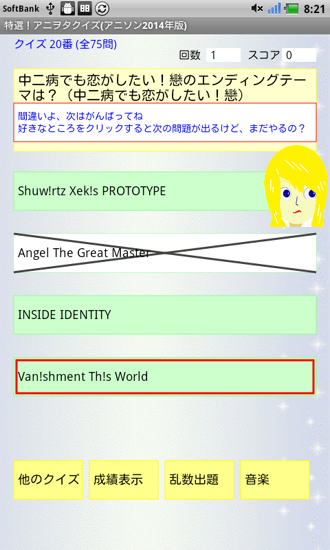 秋アニメのガールフレンド(仮)、四月は君の嘘、暁のヨナ、魔弾の王と戦姫などから、クイズ16問を追加して、合計100問にしました。