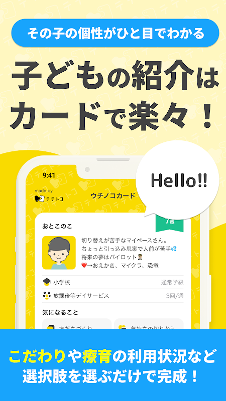 子供の年齢性別、診断の有無、気になることなどを登録するとかわいいカードが完成!
