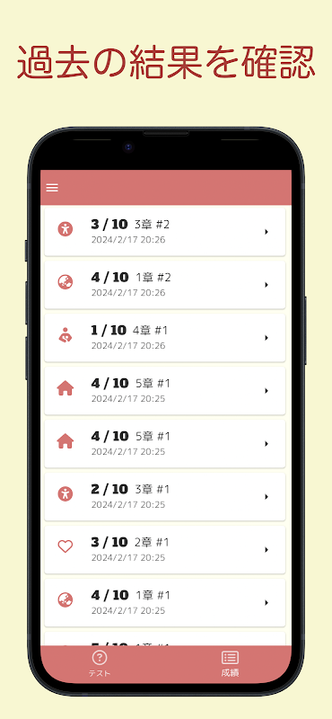 実施した問題については履歴から確認し、間違った問題を復習できます。