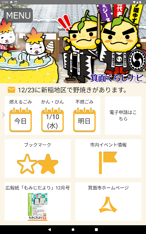 「箕面くらしナビ」は、箕面市にお住まいの方を対象とした総合アプリです。