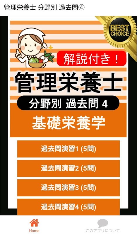このアプリでは「基礎栄養学」分野の出題になります。