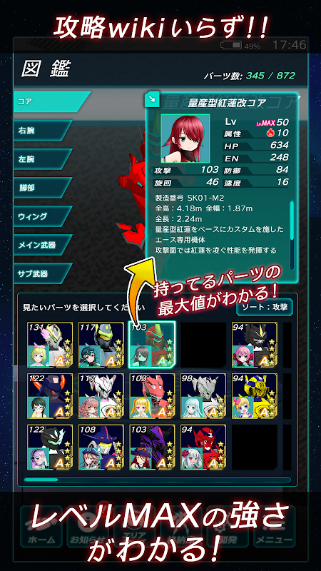 所持しているパーツのLvMax時のステータスがわかるので、何を育てたらいいのかがすぐわかる!