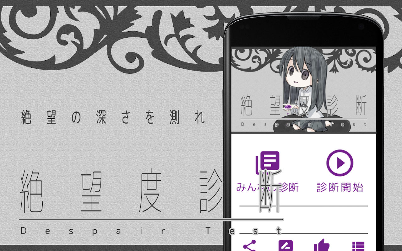 このアプリでは、自身がどれくらい絶望しているのかを、ランダムに出題される15の質問や心理テストにより診断することができます。