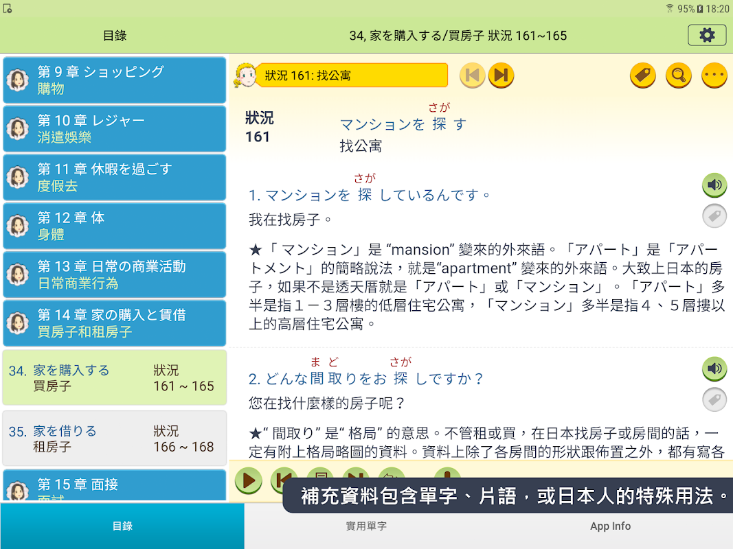 「対人交流」、「日常生活」、「職場娯楽」、「海外へ行く」の4つの主要テーマをカバーしており、状況状況は208件、緊急緊急文は4,000件以上あります。