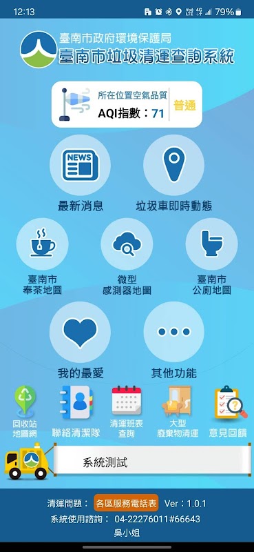 台南市環境保護局が発行する「台南ゴミ収集車APP」にはGPS衛星測位装置が設置されており、一般の人々が収集地点情報を即時に確認し、その場所の大気質や最新ニュースを把握し、お気に入りや通知機能の設定、清掃チームへの連絡、その他の機能(操作説明、リサイクルステーションマップネットワーク、フィードバック、大型廃棄物の撤去を含む)を利用できる。