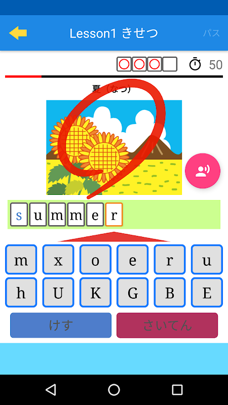 ・[レッスン]機能では、英単語帳で勉強した単語の確認テストができます。各レッスンで出題される問題を全て正解すると次のレッスンに進めます。サポートとして英単語の先頭の文字だけ最初から表示しています。分らないときは「パス」、間違ったときには「こたえ」をタップすると正解が表示されます。