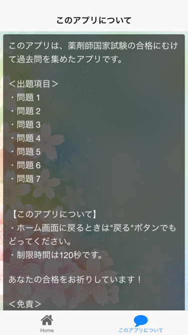 このアプリは、薬剤師国家試験の合格にむけて過去問を集めたアプリです。
