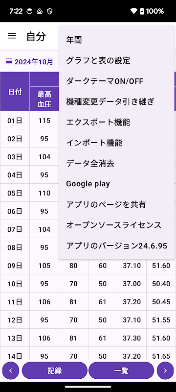 血圧と脈拍、体温、体重を記録すると平均、一覧表、グラフを表示するアプリです
