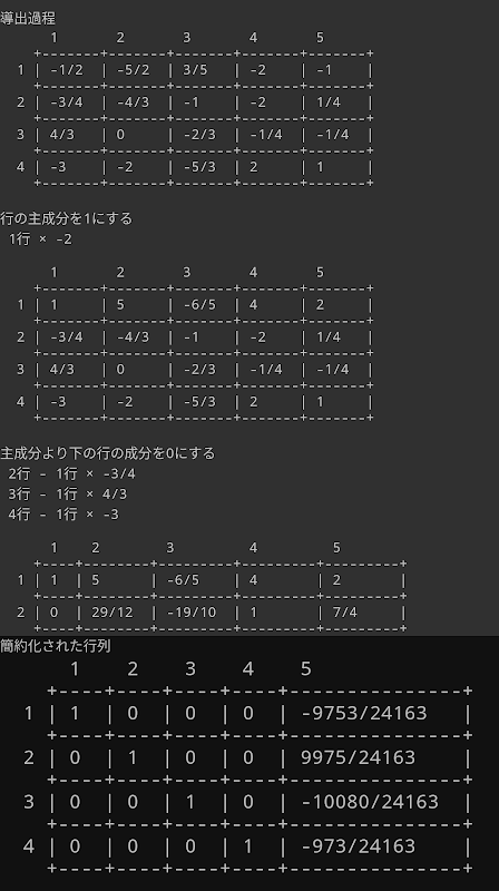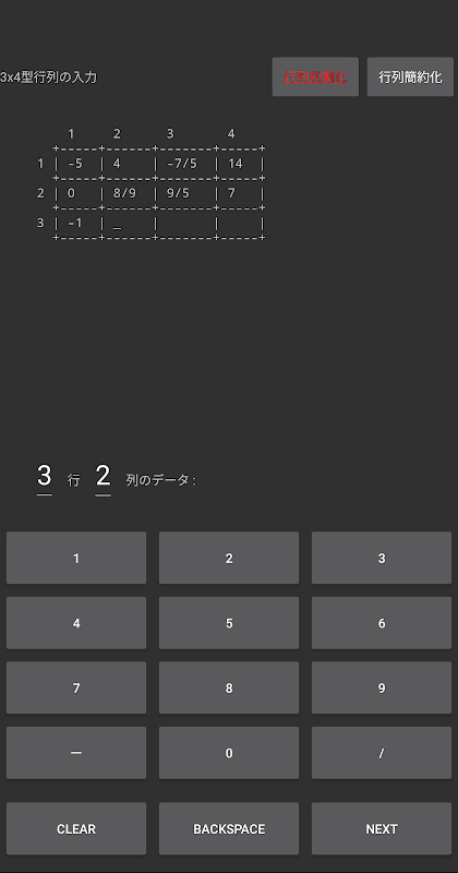 任意のサイズの行列を簡約化。分数表記に対応。途中式表示できます。