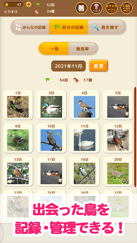 自分が出会った鳥たちをまとめたり、出会った鳥の記録を残すことができるよ!
