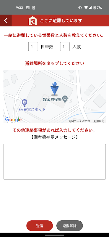 緊急時に避難している世帯数、人数、位置情報を自治体へ送信することができます。