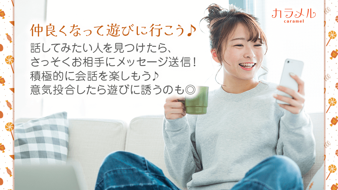 カラメルは登録無料で友達と出会える出会い系マッチングアプリ。匿名SNS風の安心会話で、人気の飲み友達・趣味友達・記念日友達など、近所の面白い友達探しにオススメ