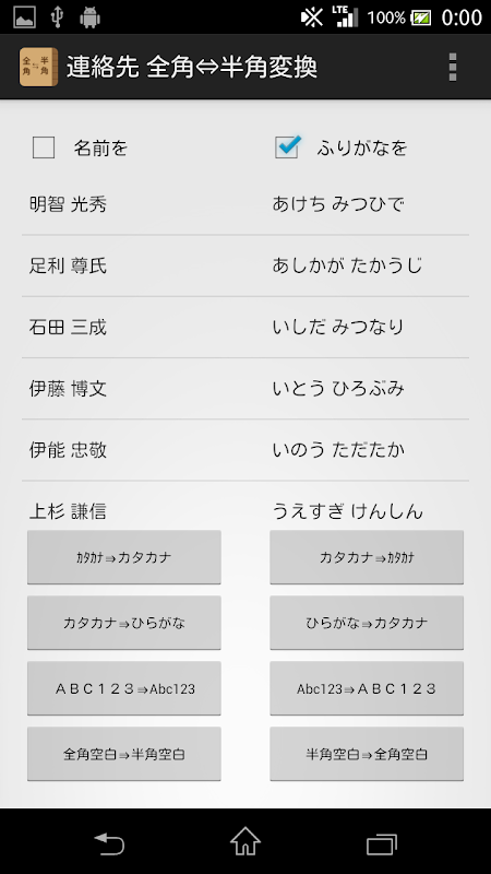 アドレス帳の 名前とふりがなで 全角⇔半角 変換を一括でやってくれるアプリです。