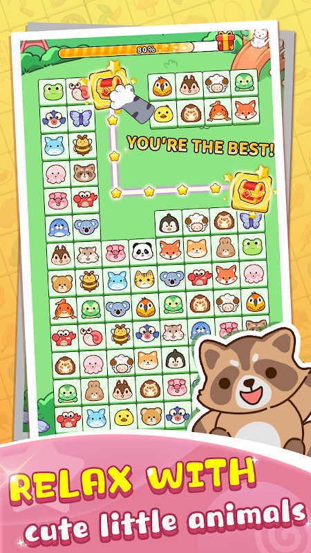 14×8のカラフルなボードで、2回までの折れ線で同じ絵柄をつなげて消去!観察力とルート計画力を試そう。全てのタイルを消せばクリア。デイリーチャレンジでは特別な難易度の問題が待ってるよ。