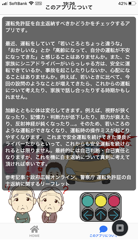 運転免許証を自主返納すべきかどうかをチェックするアプリです。