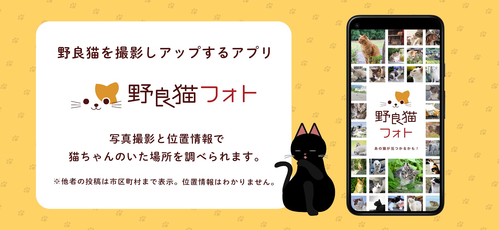 野良猫の写真を撮影して共有できるアプリです。写真の位置情報から、自分がどこで撮った写真なのか、地図上で確認することができます。