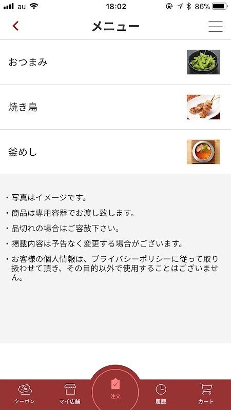 釜飯と串焼とりでんテイクアウト予約アプリの旧バージョン