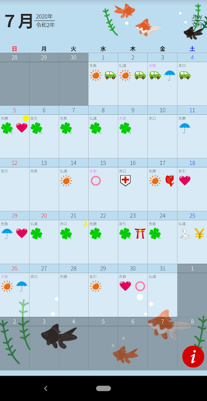このアプリは、和暦にもとづき、暦注(六曜、十干十二支、十二直、二十八宿)と選日(一粒万倍日、天赦日、不成就日、天一天上、天恩日、十方暮)をカレンダー上に見やすく表示したものです。
